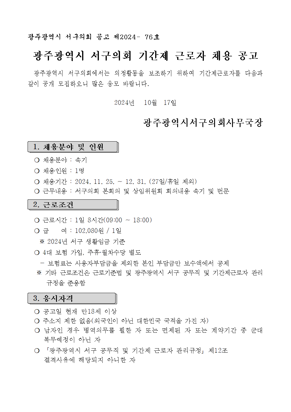 공지사항 채용공고 속기동향 자주묻는질문 CAS 키보드 A/S 커뮤니티 - 공지사항 - 채용공고 - 속기동향 - 자주묻는질문 - CAS 키보드 A/S 2024.10.21 14:37 [채용] 광주광역시 서구의회 기간제 근로자 채용 공고 (마감) 조회 수 652 ? 단축키 Prev이전 문서 Next다음 문서 크게 작게 위로 아래로 댓글로 가기 인쇄 클릭하여 첨부파일 다운로드 제327회 제2차정례회 속기 기간제근로자 채용 공고문.hwp Facebook Twitter Google Pinterest 이전 다음 위로 아래로 댓글로 가기 인쇄 ✔댓글 쓰기 에디터 선택하기 ✔ 텍스트 모드 ✔ 에디터 모드 ? 댓글 쓰기 권한이 없습니다. 로그인 하시겠습니까? 제목+내용제목내용댓글닉네임아이디태그 검색 List of Articles 번호 제목 날짜 조회 수 3267 [채용] 부산지방법원 전문임기제공무원(속기사, 마급) 경력경쟁채용시험 시행공고 (마감) 2025.10.15 306 3266 [채용] 부산광역시 사하구 속기보조 업무 기간제근로자 채용 공고 (마감) 2025.10.15 312 3265 [채용] 경기도의회 임기제공무원(속기) 임용시험 공고 (마감) 2025.10.13 428 3264 [채용] 대전광역시 서구의회 속기업무 기간제근로자 채용 공고 (마감) 2025.10.13 264 3263 [채용] 남원시의회 속기 기간제근로자 채용 공고 (진행) 2025.10.13 276 3262 [채용] 서울특별시 중랑구의회 기간제근로자(속기보조) 채용공고 (마감) 2025.10.02 400 3261 [채용] 부산광역시 영도구의회 기간제근로자 (속기) 채용 공고 (마감) 2025.10.02 260 3260 [채용] 동두천시의회 속기사 기간제 근로자 채용공고 (마감) 2025.10.02 271 3259 [채용] 남원시의회 속기 기간제근로자 채용 공고 (마감) 2025.10.02 295 3258 [채용] 대전광역시 중구의회 기간제근로자(속기사) 채용공고 (마감) 2025.10.01 340 3257 [채용] 홍천군의회 지방시간선택제임기제공무원 임용시험 공고 (마감) 2025.10.01 313 3256 [채용] 울산광역시 중구의회 속기보조 기간제근로자 채용공고 (마감) 2025.10.01 303 3255 [채용] 부산광역시 수영구의회 기간제근로자(속기사) 채용공고 (마감) 2025.10.01 282 3254 [채용] 부천시의회 속기보조 구인 (진행) 2025.10.01 372 3253 [채용] 목포시의회 기간제 근로자(속기) 채용 재공고 (마감) 2025.09.30 348 3252 [채용] 부산광역시 연제구의회 속기보조인력 채용 공고 (마감) 2025.09.30 328 3251 [채용] 창원지방법원 전문임기제공무원(속기사,마급) 경력경쟁채용시험 공고 (마감) 2025.09.29 450 3250 [채용] 부산광역시 사상구의회 기간제근로자(속기사) 채용 공고 (마감) 2025.09.29 326 3249 [채용] 익산시의회 기간제근로자(속기업무) 채용 재공고 (마감) 2025.09.29 297 3248 [채용] 세종특별자치시교육청 임기제 공무원(속기) 경력경쟁임용시험 계획 공고 (마감) 2025.09.29 412 Board Pagination Prev 1 2 3 4 5 6 7 8 9 10 11 ... 170 Next / 170 GO
