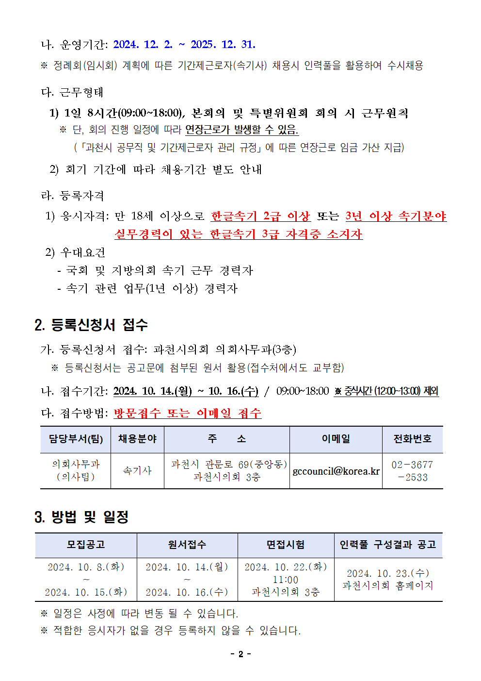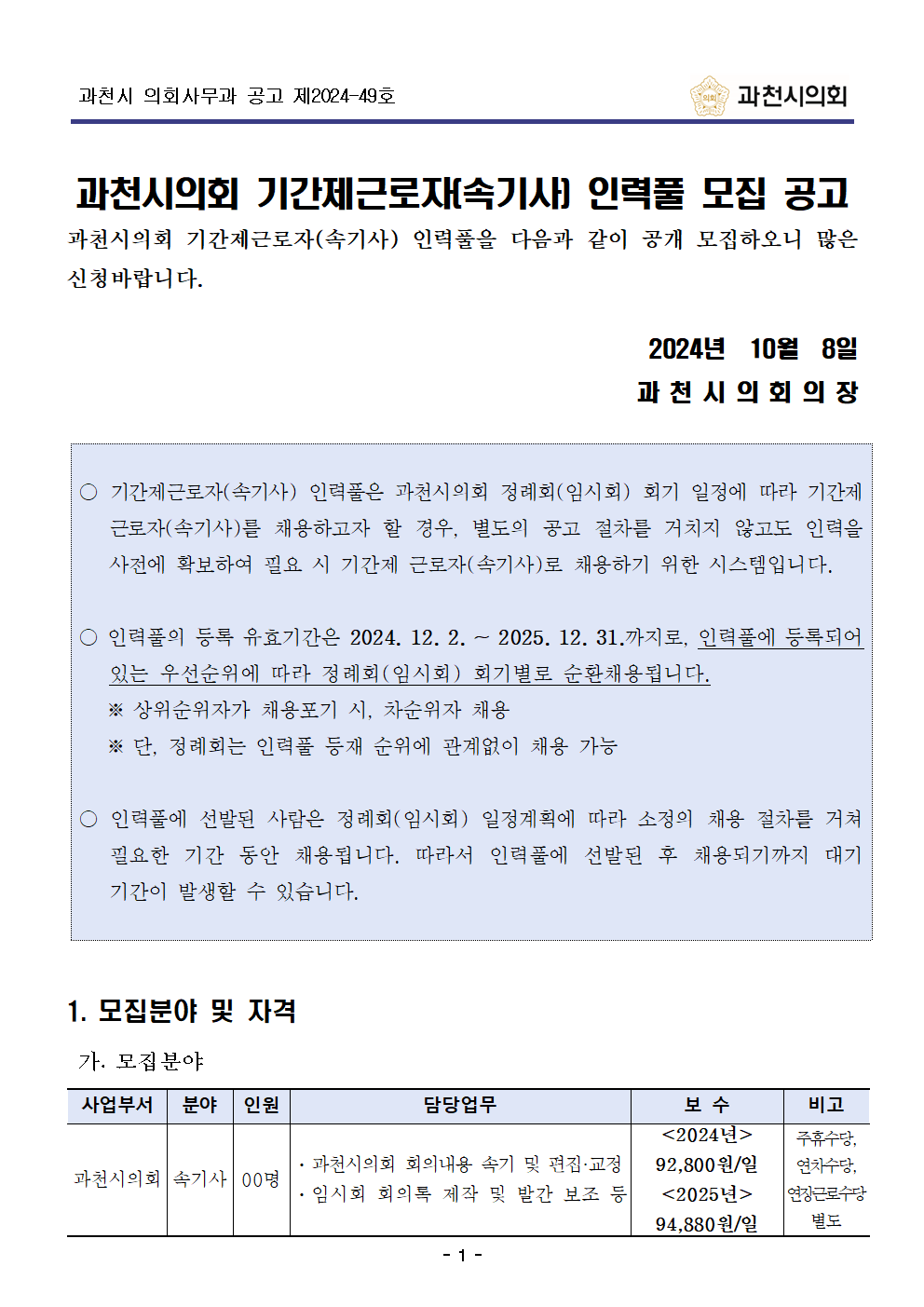공지사항 채용공고 속기동향 자주묻는질문 CAS 키보드 A/S 커뮤니티 - 공지사항 - 채용공고 - 속기동향 - 자주묻는질문 - CAS 키보드 A/S 2024.10.08 16:42 [채용] 과천시의회 기간제근로자(속기사) 인력풀 모집 공고 (마감) 조회 수 398 ? 단축키 Prev이전 문서 Next다음 문서 크게 작게 위로 아래로 댓글로 가기 인쇄 클릭하여 첨부파일 다운로드 [붙임1] 공고문.hwp [붙임2] 제출서류(서식).hwp [채용] 늘찬속기사무소 광주서부교육지원청 학폭위 출장 공고 (마감) 2024.10.08by [채용] 부산광역시 동래구의회 기간제근로자(속기사) 채용 공고 (... 2024.10.08by Facebook Twitter Google Pinterest 이전 다음 위로 아래로 댓글로 가기 인쇄 ✔댓글 쓰기 에디터 선택하기 ✔ 텍스트 모드 ✔ 에디터 모드 ? 댓글 쓰기 권한이 없습니다. 로그인 하시겠습니까? 제목+내용제목내용댓글닉네임아이디태그 검색 List of Articles 번호 제목 날짜 조회 수 2995 [채용] 서울특별시 서대문구의회 기간제근로자(속기보조) 채용 공고 (마감) 2024.10.15 473 2994 [채용] 서울특별시 용산구의회 기간제근로자(속기) 채용 공고 (마감) 2024.10.15 372 2993 [채용] 연합뉴스 북한방송 모니터링 임시직 속기사 채용 공고 (마감) 2024.10.14 402 2992 [채용] 대전광역시 중구의회 기간제근로자 (속기사) 채용공고(2차) (마감) 2024.10.14 406 2991 [채용] 대전광역시 서구의회 속기업무 기간제근로자 채용 재공고 (마감) 2024.10.14 526 2990 [채용] 울산지방검찰청 한시임기제공무원(속기사) 경력경쟁채용시험 시행 계획 공고 (마감) 2024.10.14 364 2989 [채용] 행정안전부 전문경력관(속기) 공무원 채용 공고 (마감) 2024.10.14 441 2988 [채용] 수원지방검찰청 성남지청 기간제근로자(속기사) 경력경쟁채용시험 공고 (마감) 2024.10.14 365 2987 [채용] 경상북도의회사무처 기간제근로자(속기) 추가(3차) 채용 공고 (마감) 2024.10.14 376 2986 [채용] 부산광역시 사상구의회 기간제근로자(속기사) 채용 공고 (마감) 2024.10.14 388 2985 [채용] 부산광역시 영도구의회 정례회 기간제근로자(속기사) 채용 공고 (마감) 2024.10.14 394 2984 [채용] 늘찬속기사무소 광주서부교육지원청 10월 23~25일 출장 공고 (마감) 2024.10.14 423 2983 [채용] 충청남도의회 기간제근로자(속기) 채용시험 시행계획 공고 (마감) 2024.10.10 323 2982 [채용] 목포시의회 기간제 근로자(속기보조인력) 채용 공고 (마감) 2024.10.10 485 2981 [채용] 화성시의회 기간제근로자(속기사) 채용 공고 (2차) (마감) 2024.10.10 434 2980 [채용] 서울특별시 성동구의회 속기보조 채용 공고 (마감) 2024.10.10 371 2979 [채용] 늘찬속기사무소 채용 공고 (마감) 2024.10.08 478 2978 [채용] 늘찬속기사무소 광주서부교육지원청 학폭위 출장 공고 (마감) 2024.10.08 353 » [채용] 과천시의회 기간제근로자(속기사) 인력풀 모집 공고 (마감) 2024.10.08 398 2976 [채용] 부산광역시 동래구의회 기간제근로자(속기사) 채용 공고 (마감) 2024.10.08 325 Board Pagination Prev 1 ... 14 15 16 17 18 19 20 21 22 23 ... 168 Next / 168 GO