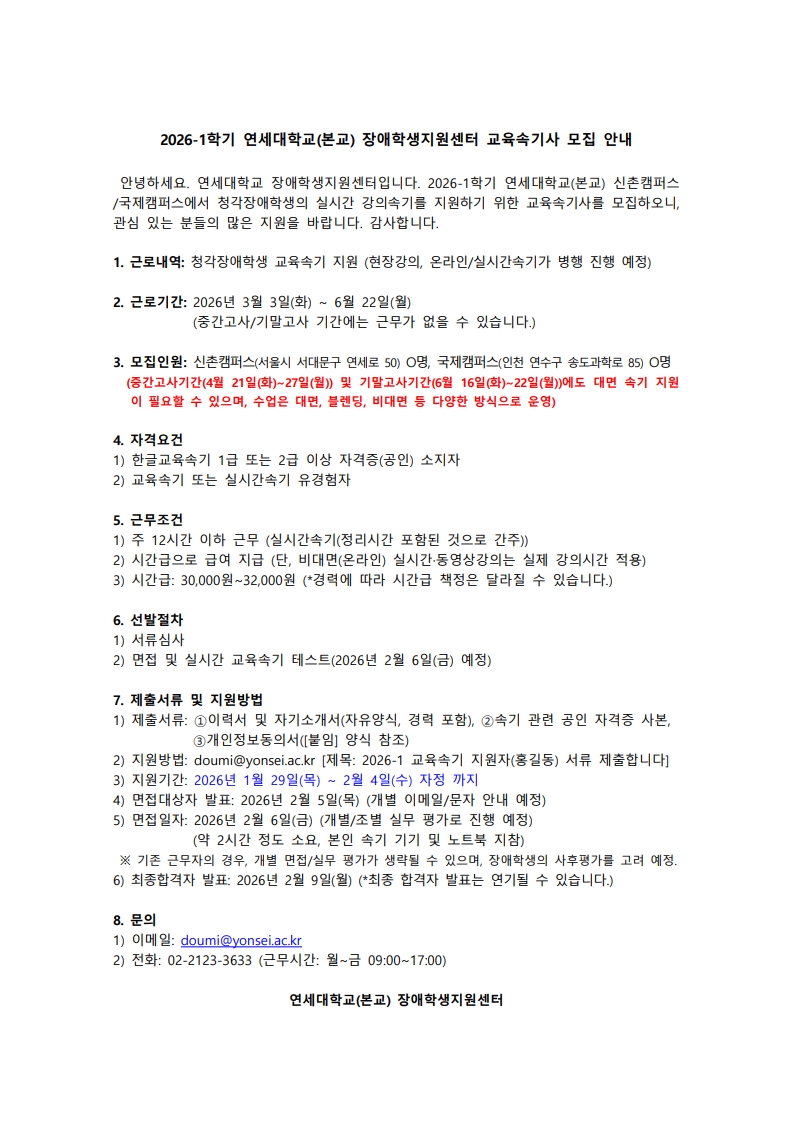 공지사항 채용공고 속기동향 자주묻는질문 CAS 키보드 A/S 커뮤니티 - 공지사항 - 채용공고 - 속기동향 - 자주묻는질문 - CAS 키보드 A/S 2026.01.30 09:17 [채용] 연세대학교 장애학생지원센터 교육속기사 모집 안내 (마감) 조회 수 40 ? 단축키 Prev이전 문서 Next다음 문서 크게 작게 위로 아래로 댓글로 가기 인쇄 클릭하여 첨부파일 다운로드 (신촌+국제)[모집공고문]2026-1 연세대학교 교육속기사 모집공고.pdf [개인정보동의서]2026-1 연세대학교 장애학생지원센터 교육속기사 지원.pdf [채용] 홍성군의회 기간제근로자 채용계획 공고 (진행) 2026.02.02by [채용] 서울대학교 장애인학생지원센터 전문교육지원인력(속기사)... 2026.01.28by Facebook Twitter Google Pinterest 이전 다음 위로 아래로 댓글로 가기 인쇄 ✔댓글 쓰기 에디터 선택하기 ✔ 텍스트 모드 ✔ 에디터 모드 ? 댓글 쓰기 권한이 없습니다. 로그인 하시겠습니까? 제목+내용제목내용댓글닉네임아이디태그 검색 List of Articles 번호 제목 날짜 조회 수 3361 [채용] 춘천지방법원 한시임기제공무원(속기) 경력경쟁채용시험 공고 (마감) 2026.02.04 142 3360 [채용] 홍성군의회 기간제근로자 채용계획 공고 (진행) 2026.02.02 150 » [채용] 연세대학교 장애학생지원센터 교육속기사 모집 안내 (마감) 2026.01.30 40 3358 [채용] 서울대학교 장애인학생지원센터 전문교육지원인력(속기사) 채용 공고 (마감) 2026.01.28 174 3357 [채용] 경상북도 소재 공공기관 임시속기사 채용 공고 (마감) [협회 추천] 2026.01.27 41 3356 [채용] 사천시의회 한시임기제공무원(속기) 임용시험 계획 재공고 (마감) 2026.01.27 161 3355 [채용] 서대문구의회 기간제근로자(속기보조) 채용공고 (마감) 2026.01.20 194 3354 [채용] 청주지방법원 전문임기제공무원 속기사 경력경쟁채용시험 공고 (진행) 2026.01.20 167 3353 [채용] 대전지방법원 전문임기제공무원(속기) 경력경쟁채용시험 공고 (마감) 2026.01.19 143 3352 [채용] 대검찰청 기간제근로자(속기) 채용시험 시행계획 공고 (마감) 2026.01.19 148 3351 [채용] 중앙해양안전심판원 기간제 근로자(속기) 채용 공고 (마감) 2026.01.19 131 3350 [채용] 영등포구의회 기간제근로자(속기) 채용 공고 (마감) 2026.01.19 169 3349 [채용] 광주지방법원 전문임기제공무원(속기) 경력경쟁치용시험 시행계획 공고 (마감) 2026.01.15 212 3348 [채용] 대구광역시동구의회 한시임기제공무원(속기) 경력경쟁임용시험 공고 (마감) 2026.01.14 91 3347 [채용] (주)한국스테노 회의록 작성 프리랜서 속기사(재택근무) 모집 (마감) 2026.01.14 314 3346 [채용] 울산지방법원 한시임기제공무원(속기) 경력경쟁채용시험 공고 (마감) 2026.01.14 90 3345 [채용] 인천광역시의회 기간제근로자(속기) 채용 공고 (마감) 2026.01.14 126 3344 [채용] 대구고등법원 속기서기보 경력경쟁채용시험 시행 공고 (마감) 2026.01.14 153 3343 [채용] 사천시의회 한시임기제공무원(속기) 임용시험 계획 공고 (마감) 2026.01.13 101 3342 [채용] 창원시의회 한시임기제공무원(속기) 임용시험 계획 공고 (마감) 2026.01.13 98 Board Pagination Prev 1 2 3 4 5 6 7 8 9 10 ... 169 Next / 169 GO